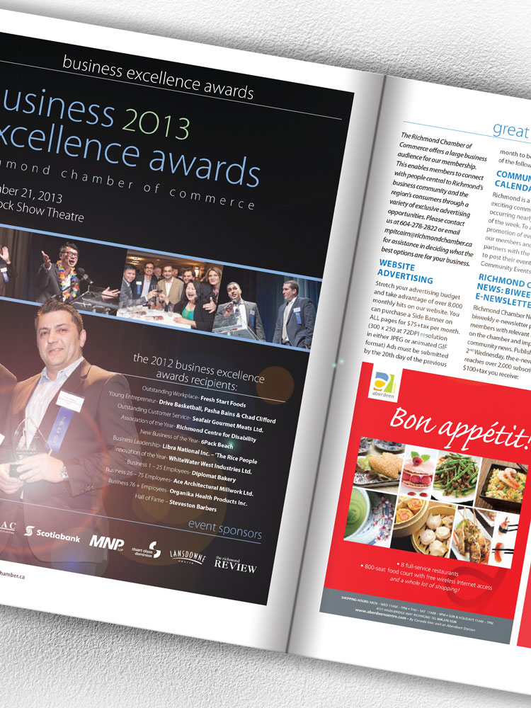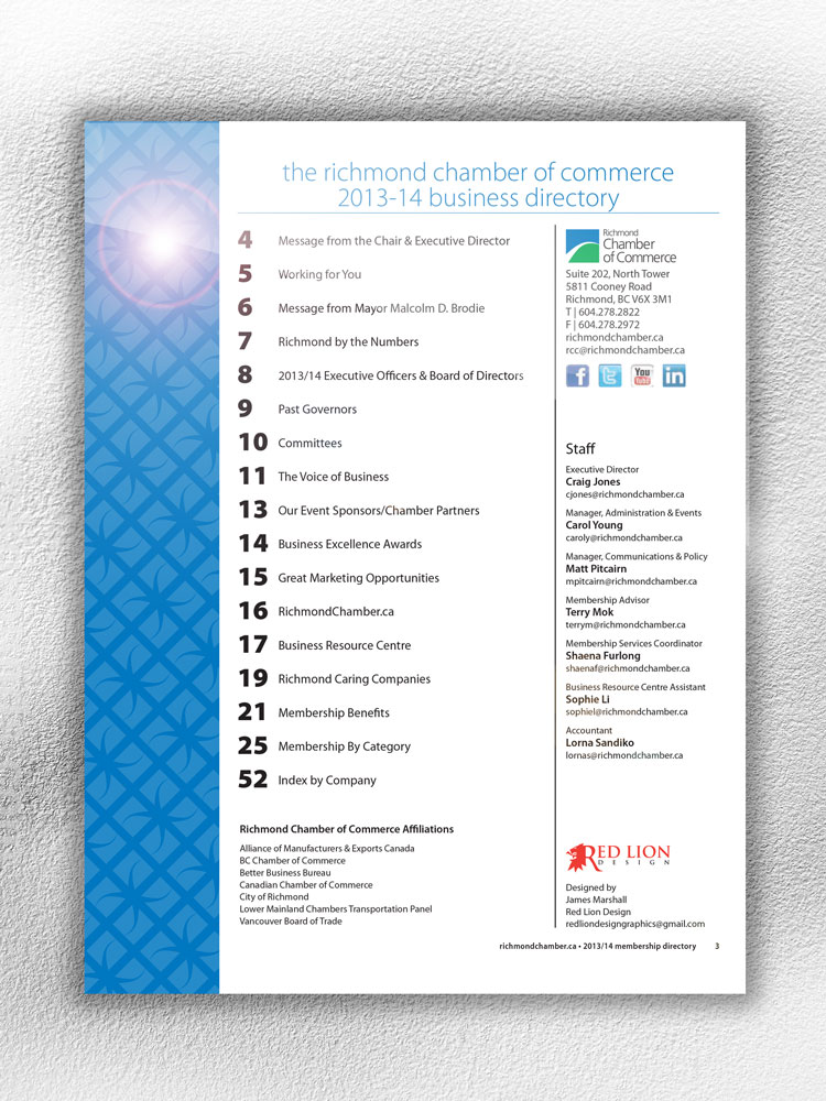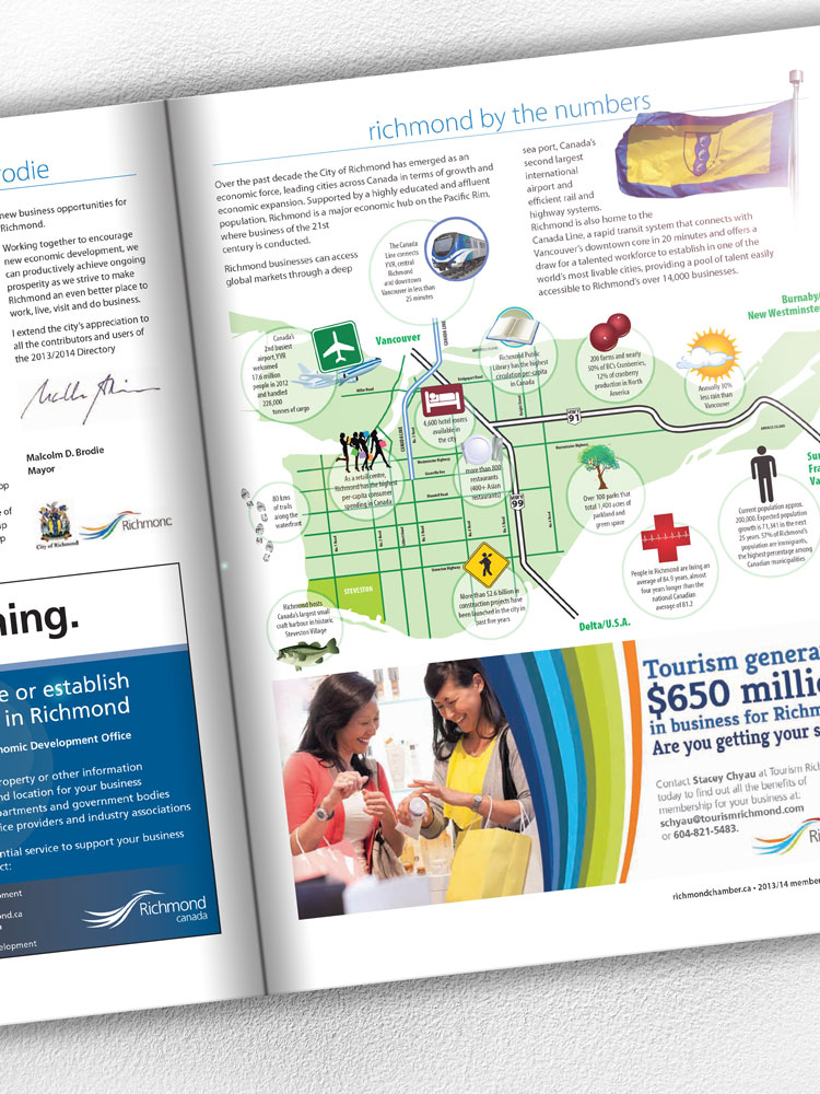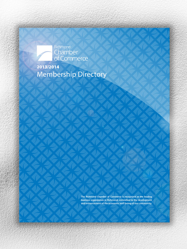 In the spring of 2013, the Richmond Chamber of Commerce was looking to update the member ship directory with a number of challenges that they asked me to solve. They were looking to create a more elegant look to their existing directory while still appearing to be business-like. They also needed a bit of a different look to the existing directory, making it more modern and contemporary.
